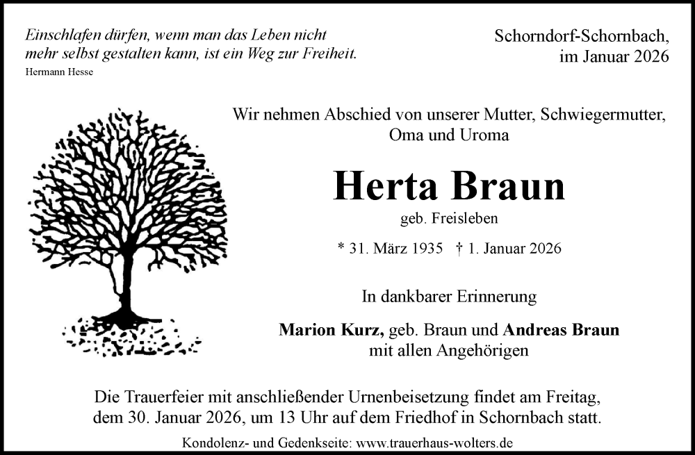 Hier finden Sie alle Traueranzeigen aus der Zeitung, die bisher für Herta Braun erschienen sind. Weitere Traueranzeigen, die in der Zeitung erscheinen, werden hier ebenfalls aufgelistet