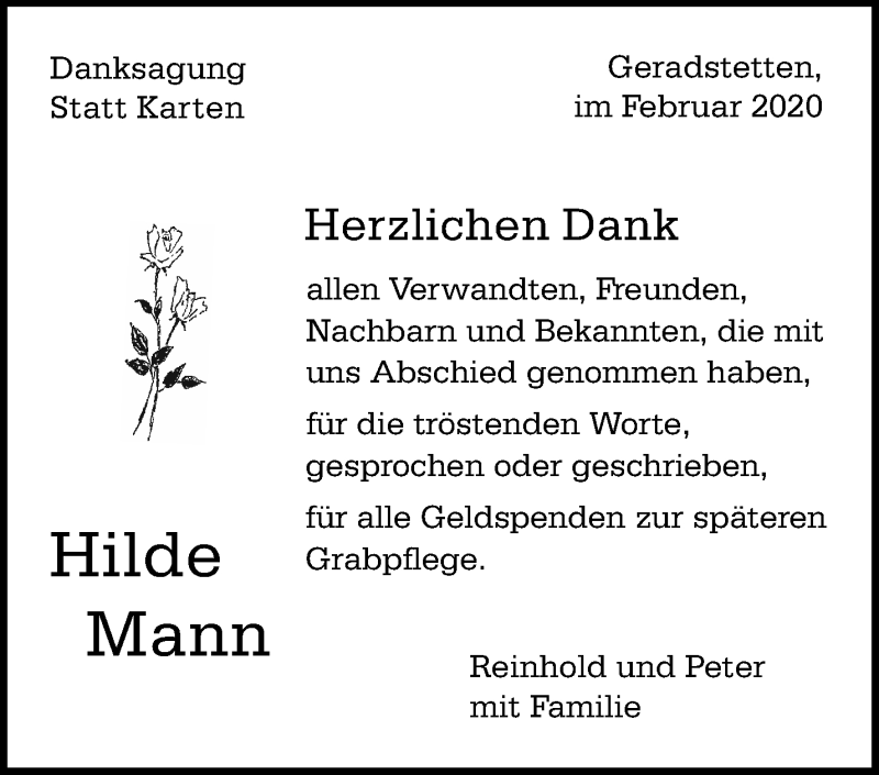 Hier finden Sie alle Traueranzeigen aus der Zeitung, die bisher für Hilde Mann erschienen sind. Weitere Traueranzeigen, die in der Zeitung erscheinen, werden hier ebenfalls aufgelistet