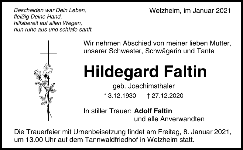 Hier finden Sie alle Traueranzeigen aus der Zeitung, die bisher für Hildegard Faltin erschienen sind. Weitere Traueranzeigen, die in der Zeitung erscheinen, werden hier ebenfalls aufgelistet