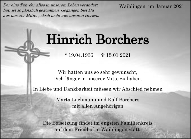 Hier finden Sie alle Traueranzeigen aus der Zeitung, die bisher für Hinrich Borchers erschienen sind. Weitere Traueranzeigen, die in der Zeitung erscheinen, werden hier ebenfalls aufgelistet