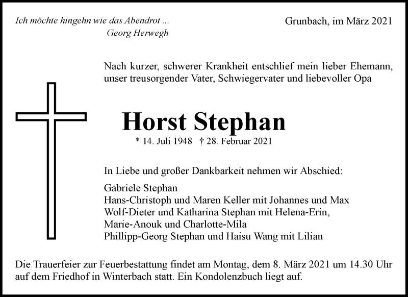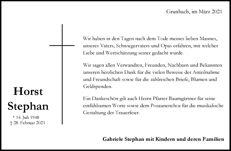 Hier finden Sie alle Traueranzeigen aus der Zeitung, die bisher für Horst Stephan erschienen sind. Weitere Traueranzeigen, die in der Zeitung erscheinen, werden hier ebenfalls aufgelistet