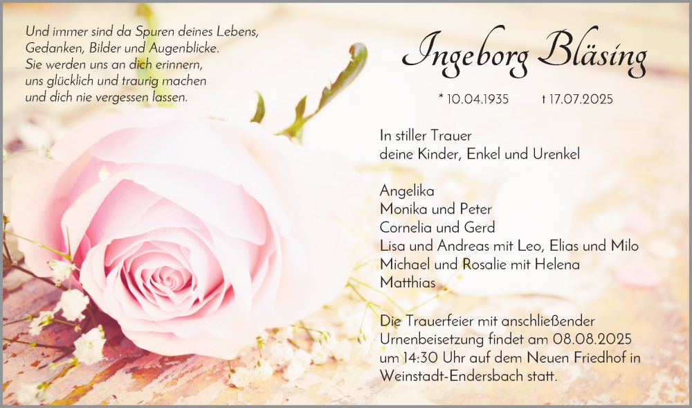 Hier finden Sie alle Traueranzeigen aus der Zeitung, die bisher für Ingeborg Bläsing erschienen sind. Weitere Traueranzeigen, die in der Zeitung erscheinen, werden hier ebenfalls aufgelistet