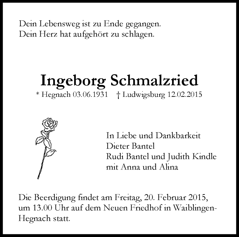 Hier finden Sie alle Traueranzeigen aus der Zeitung, die bisher für Ingeborg Schmalzried erschienen sind. Weitere Traueranzeigen, die in der Zeitung erscheinen, werden hier ebenfalls aufgelistet