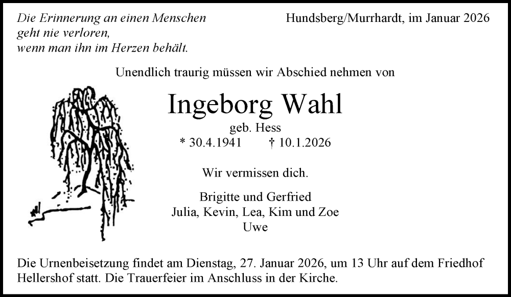 Hier finden Sie alle Traueranzeigen aus der Zeitung, die bisher für Ingeborg Wahl erschienen sind. Weitere Traueranzeigen, die in der Zeitung erscheinen, werden hier ebenfalls aufgelistet