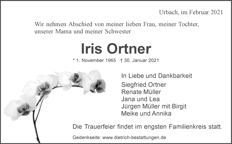 Hier finden Sie alle Traueranzeigen aus der Zeitung, die bisher für Iris Ortner erschienen sind. Weitere Traueranzeigen, die in der Zeitung erscheinen, werden hier ebenfalls aufgelistet