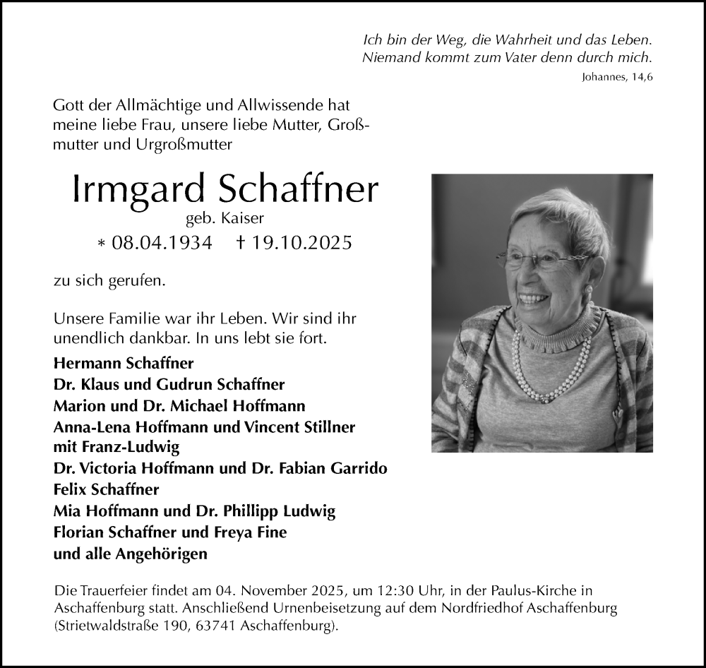 Hier finden Sie alle Traueranzeigen aus der Zeitung, die bisher für Irmgard Schaffner erschienen sind. Weitere Traueranzeigen, die in der Zeitung erscheinen, werden hier ebenfalls aufgelistet