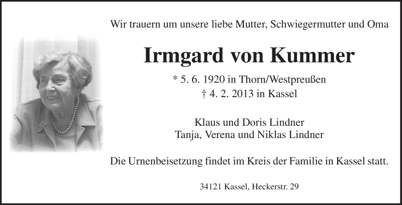 Hier finden Sie alle Traueranzeigen aus der Zeitung, die bisher für Irmgard von Kummer erschienen sind. Weitere Traueranzeigen, die in der Zeitung erscheinen, werden hier ebenfalls aufgelistet