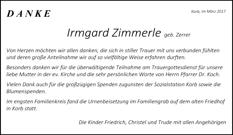Hier finden Sie alle Traueranzeigen aus der Zeitung, die bisher für Irmgard Zimmerle erschienen sind. Weitere Traueranzeigen, die in der Zeitung erscheinen, werden hier ebenfalls aufgelistet