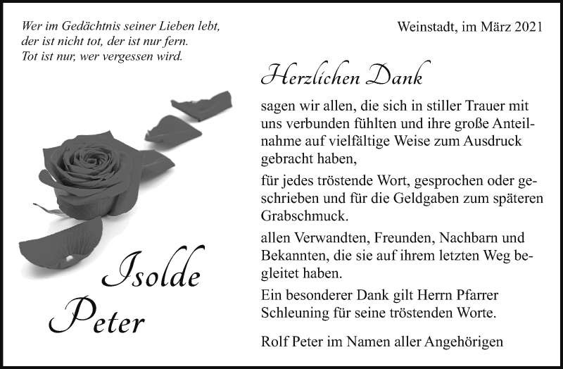 Hier finden Sie alle Traueranzeigen aus der Zeitung, die bisher für Isolde Peter erschienen sind. Weitere Traueranzeigen, die in der Zeitung erscheinen, werden hier ebenfalls aufgelistet