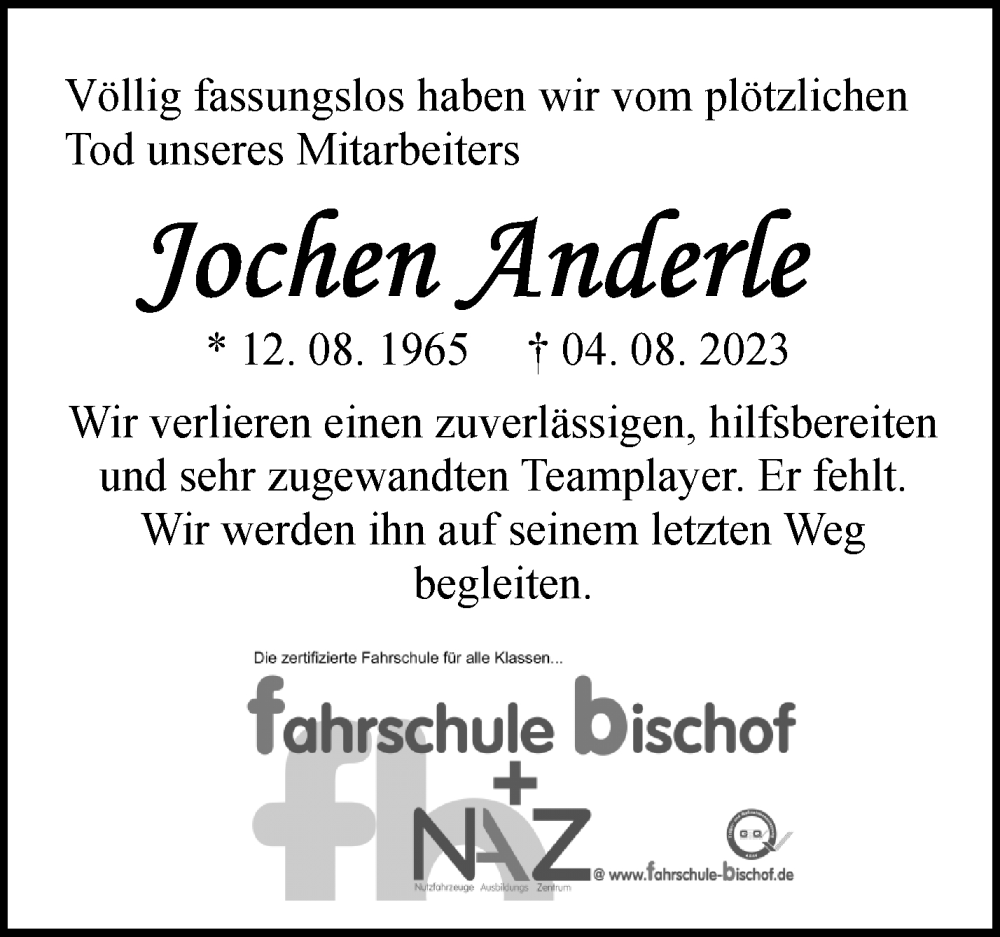 Hier finden Sie alle Traueranzeigen aus der Zeitung, die bisher für Jochen Anderle erschienen sind. Weitere Traueranzeigen, die in der Zeitung erscheinen, werden hier ebenfalls aufgelistet