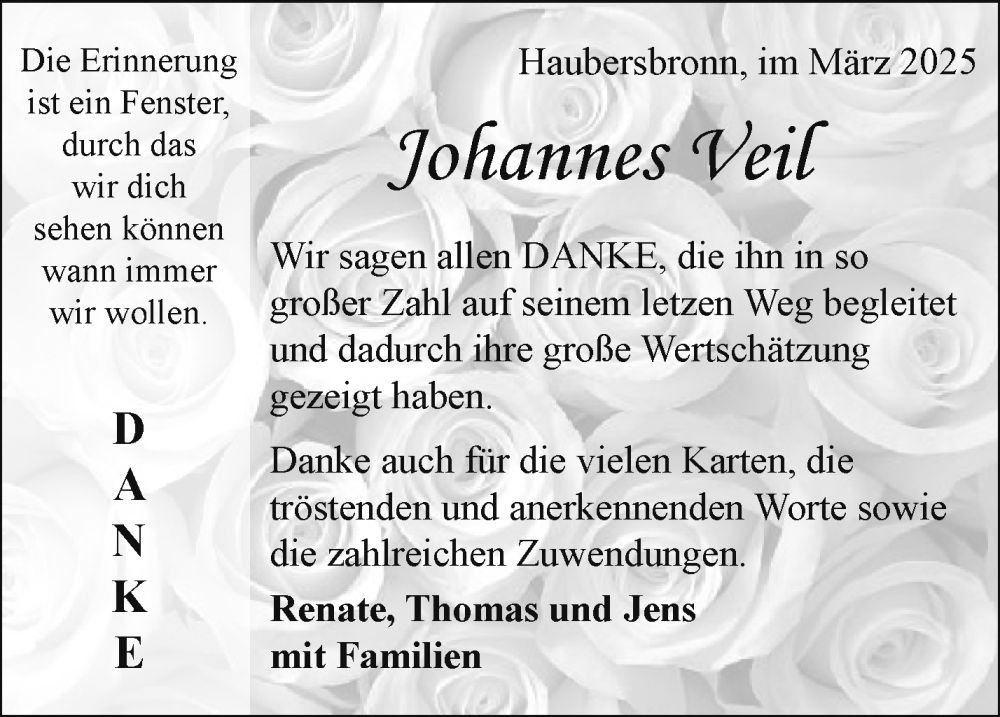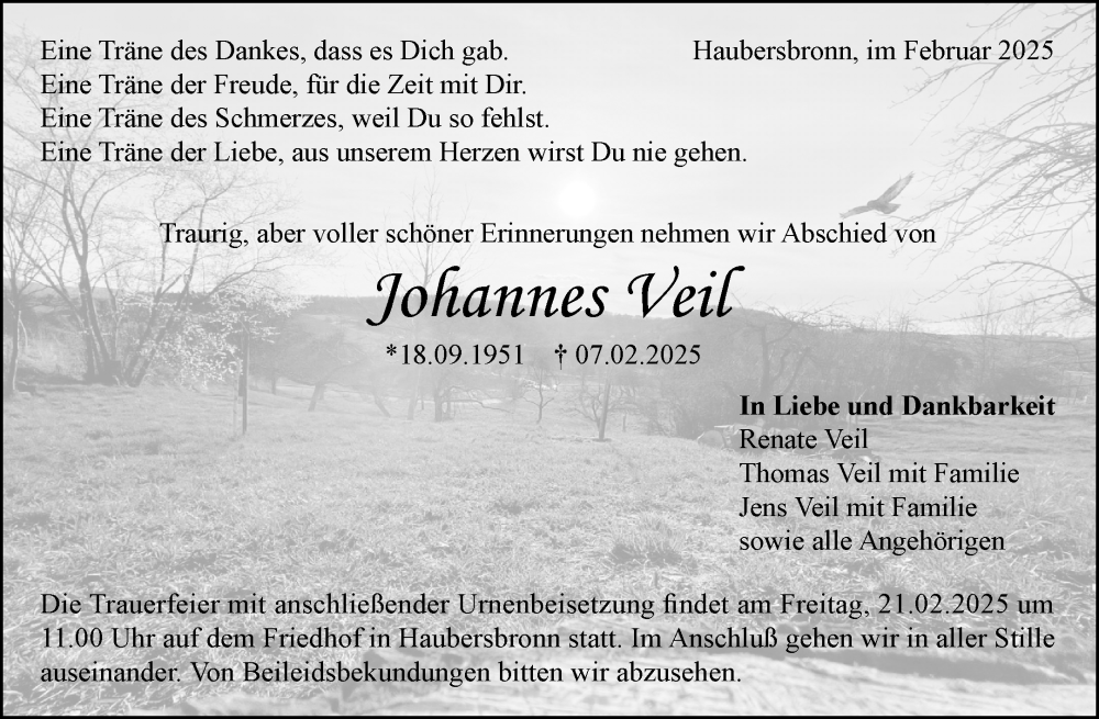 Hier finden Sie alle Traueranzeigen aus der Zeitung, die bisher für Johannes Veil erschienen sind. Weitere Traueranzeigen, die in der Zeitung erscheinen, werden hier ebenfalls aufgelistet