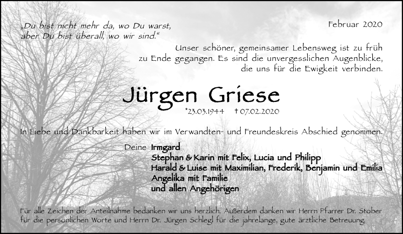 Hier finden Sie alle Traueranzeigen aus der Zeitung, die bisher für Jürgen Griese erschienen sind. Weitere Traueranzeigen, die in der Zeitung erscheinen, werden hier ebenfalls aufgelistet