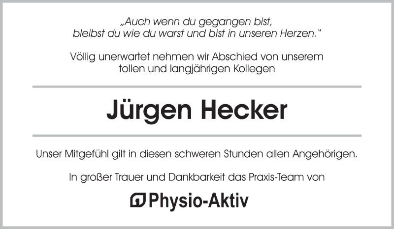 Hier finden Sie alle Traueranzeigen aus der Zeitung, die bisher für Jürgen Hecker erschienen sind. Weitere Traueranzeigen, die in der Zeitung erscheinen, werden hier ebenfalls aufgelistet