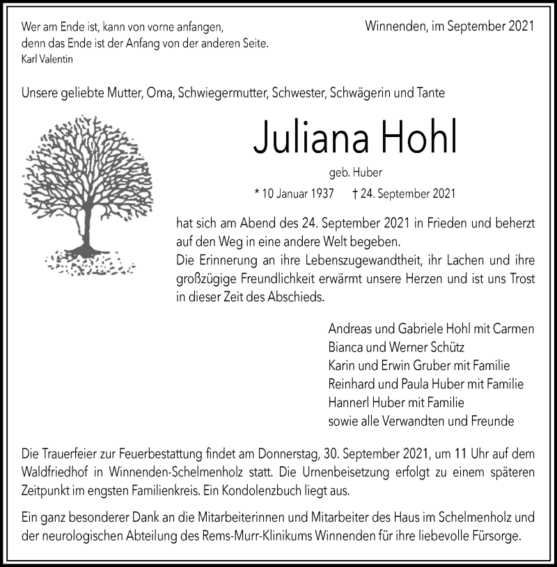 Hier finden Sie alle Traueranzeigen aus der Zeitung, die bisher für Juliana Hohl erschienen sind. Weitere Traueranzeigen, die in der Zeitung erscheinen, werden hier ebenfalls aufgelistet