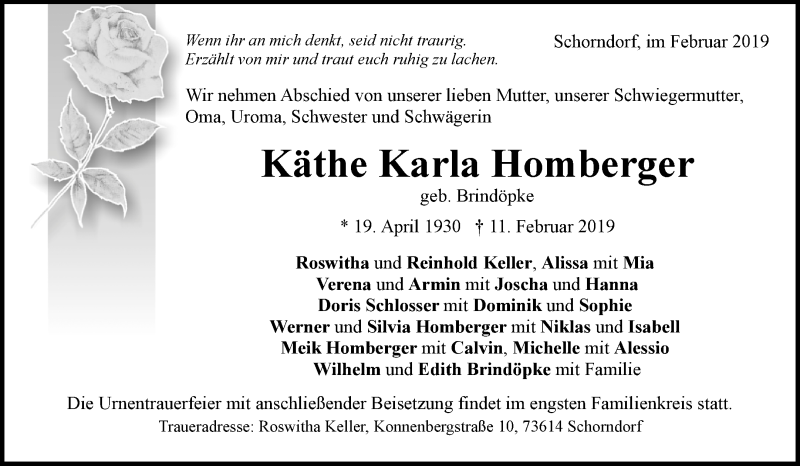 Hier finden Sie alle Traueranzeigen aus der Zeitung, die bisher für Käthe Karla Homberger erschienen sind. Weitere Traueranzeigen, die in der Zeitung erscheinen, werden hier ebenfalls aufgelistet