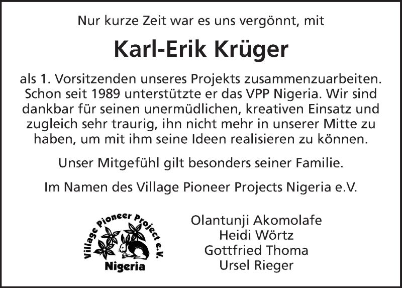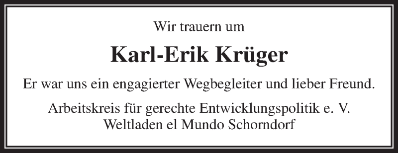 Hier finden Sie alle Traueranzeigen aus der Zeitung, die bisher für Karl-Erik Krüger erschienen sind. Weitere Traueranzeigen, die in der Zeitung erscheinen, werden hier ebenfalls aufgelistet