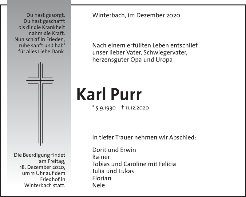 Hier finden Sie alle Traueranzeigen aus der Zeitung, die bisher für Karl Purr erschienen sind. Weitere Traueranzeigen, die in der Zeitung erscheinen, werden hier ebenfalls aufgelistet
