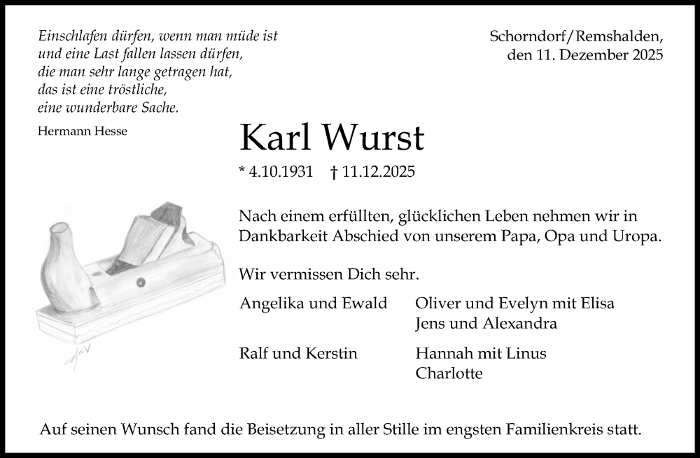 Hier finden Sie alle Traueranzeigen aus der Zeitung, die bisher für Karl Wurst erschienen sind. Weitere Traueranzeigen, die in der Zeitung erscheinen, werden hier ebenfalls aufgelistet