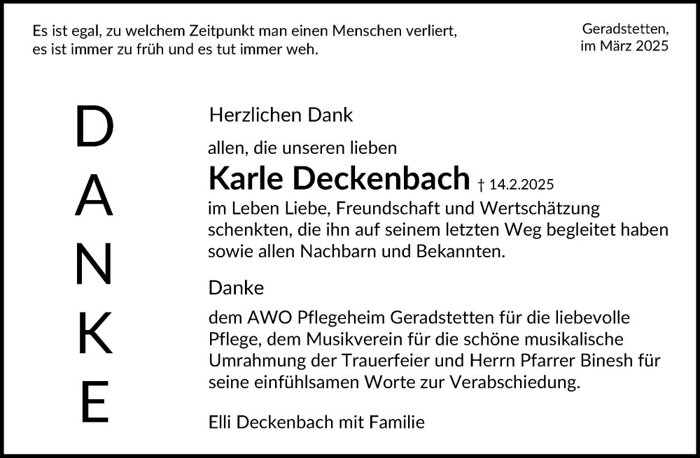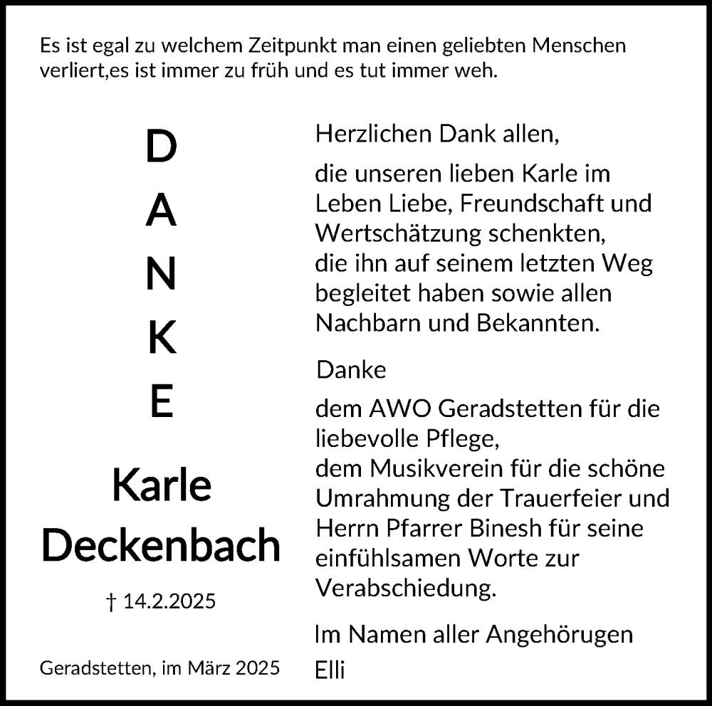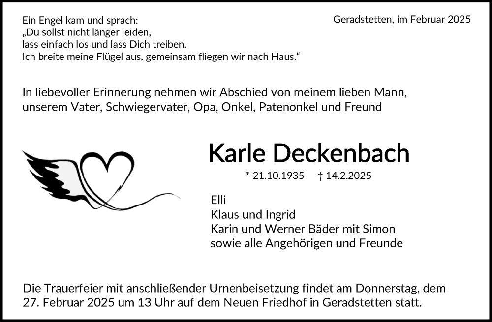 Hier finden Sie alle Traueranzeigen aus der Zeitung, die bisher für Karle Deckenbach erschienen sind. Weitere Traueranzeigen, die in der Zeitung erscheinen, werden hier ebenfalls aufgelistet