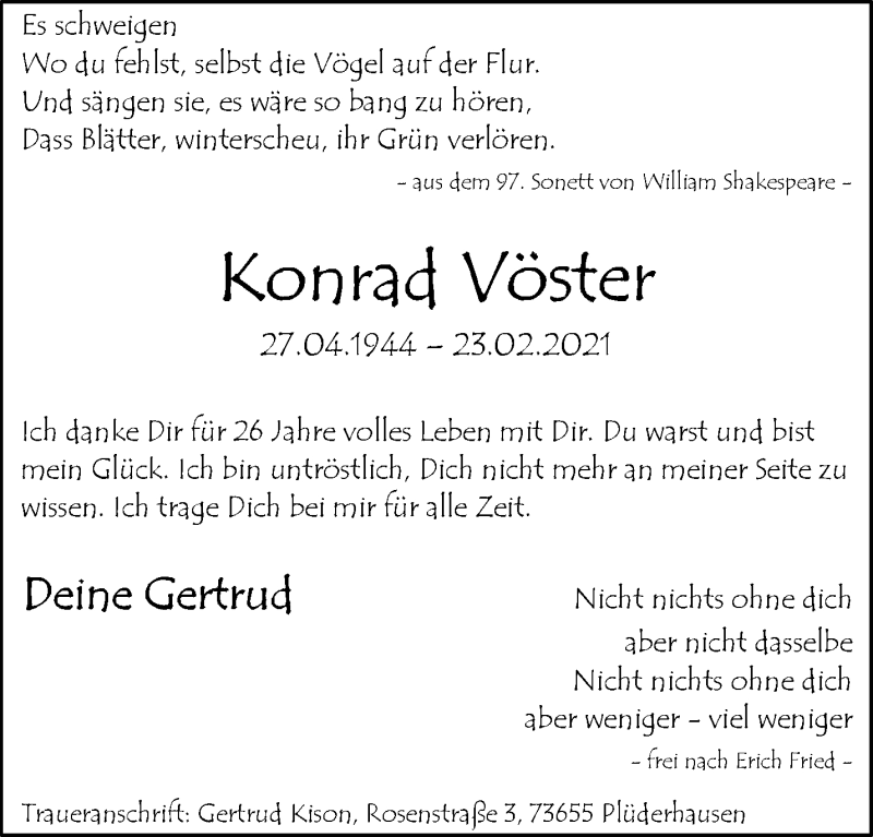Hier finden Sie alle Traueranzeigen aus der Zeitung, die bisher für Konrad Vöster erschienen sind. Weitere Traueranzeigen, die in der Zeitung erscheinen, werden hier ebenfalls aufgelistet