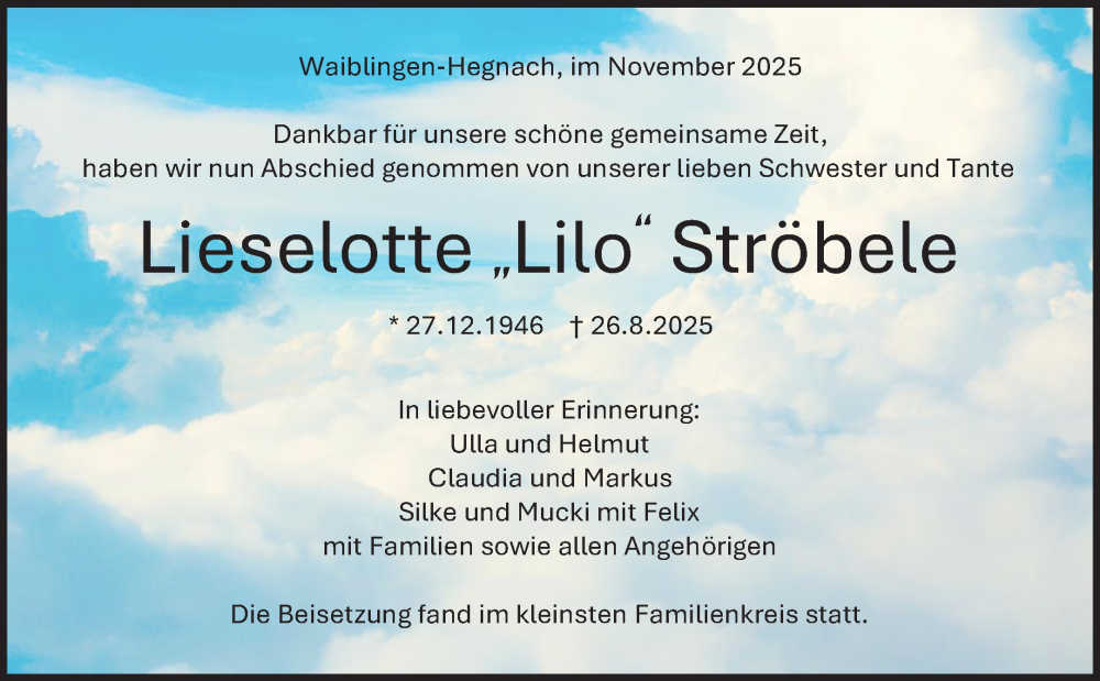 Hier finden Sie alle Traueranzeigen aus der Zeitung, die bisher für Lieselotte Ströbele erschienen sind. Weitere Traueranzeigen, die in der Zeitung erscheinen, werden hier ebenfalls aufgelistet
