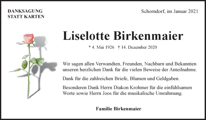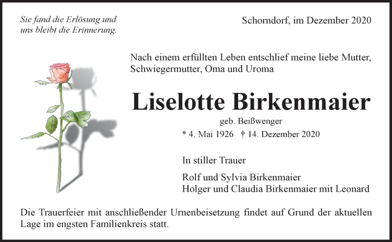 Hier finden Sie alle Traueranzeigen aus der Zeitung, die bisher für Liselotte Birkenmaier erschienen sind. Weitere Traueranzeigen, die in der Zeitung erscheinen, werden hier ebenfalls aufgelistet