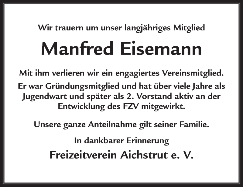 Hier finden Sie alle Traueranzeigen aus der Zeitung, die bisher für Manfred Eisemann erschienen sind. Weitere Traueranzeigen, die in der Zeitung erscheinen, werden hier ebenfalls aufgelistet