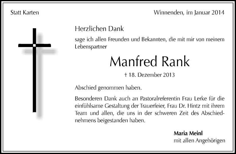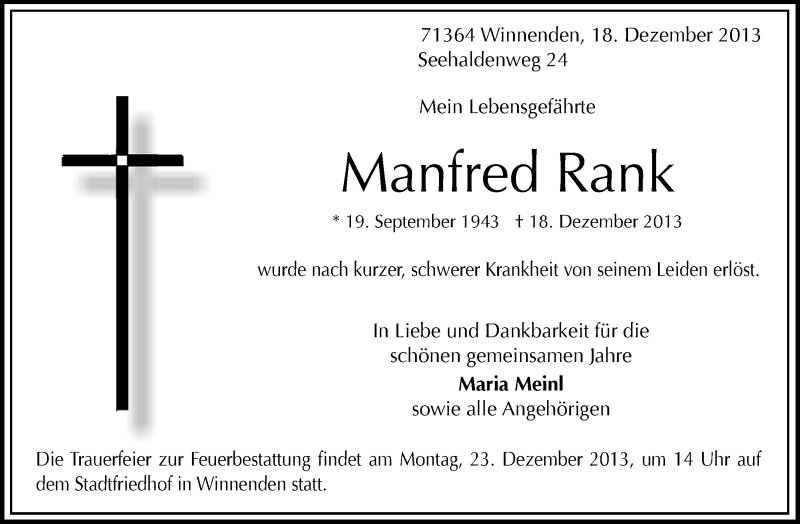 Hier finden Sie alle Traueranzeigen aus der Zeitung, die bisher für Manfred Rank erschienen sind. Weitere Traueranzeigen, die in der Zeitung erscheinen, werden hier ebenfalls aufgelistet