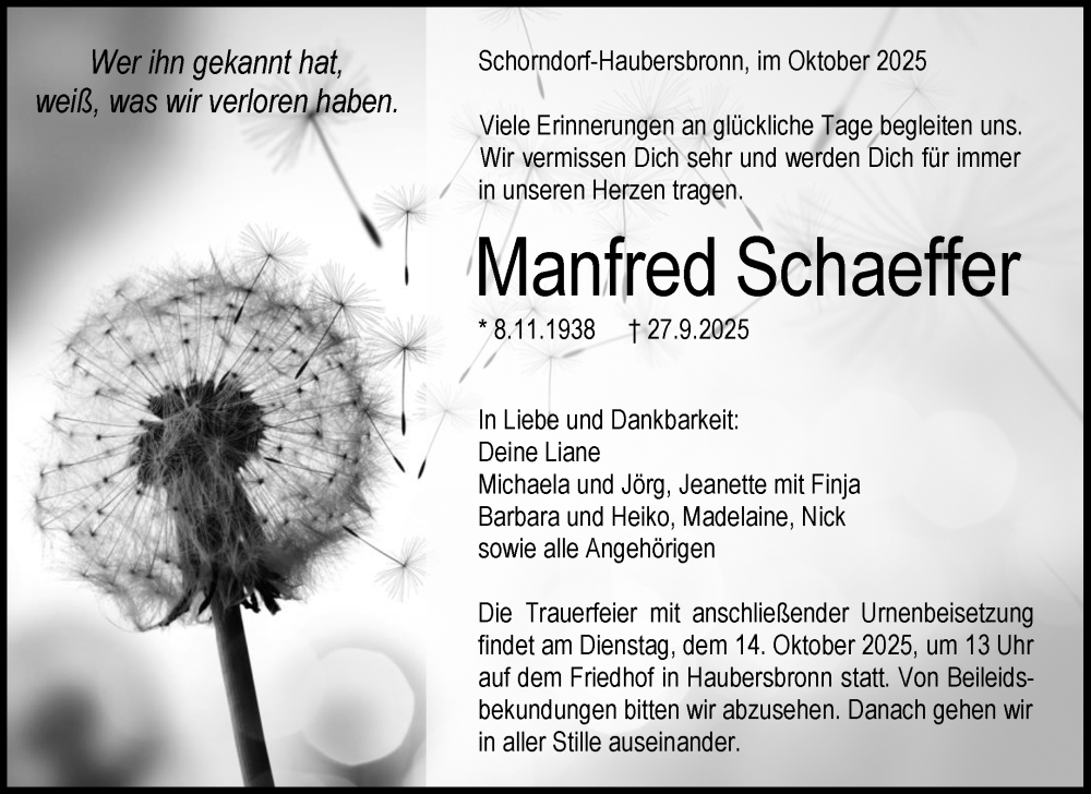 Hier finden Sie alle Traueranzeigen aus der Zeitung, die bisher für Manfred Schaeffer erschienen sind. Weitere Traueranzeigen, die in der Zeitung erscheinen, werden hier ebenfalls aufgelistet