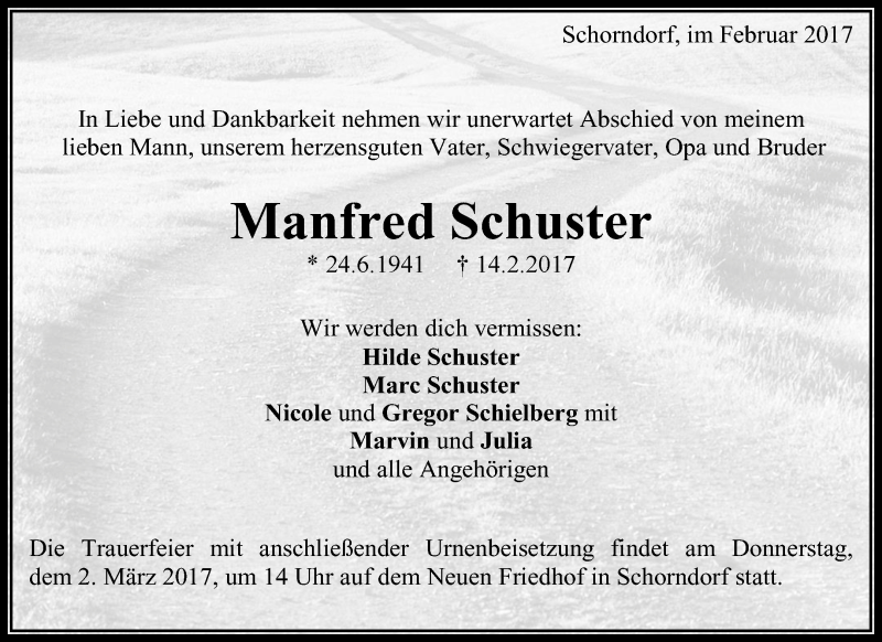 Hier finden Sie alle Traueranzeigen aus der Zeitung, die bisher für Manfred Schuster erschienen sind. Weitere Traueranzeigen, die in der Zeitung erscheinen, werden hier ebenfalls aufgelistet