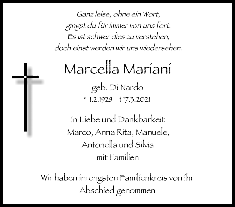 Hier finden Sie alle Traueranzeigen aus der Zeitung, die bisher für Marcella Mariani erschienen sind. Weitere Traueranzeigen, die in der Zeitung erscheinen, werden hier ebenfalls aufgelistet