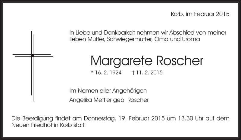 Hier finden Sie alle Traueranzeigen aus der Zeitung, die bisher für Margarete Roscher erschienen sind. Weitere Traueranzeigen, die in der Zeitung erscheinen, werden hier ebenfalls aufgelistet
