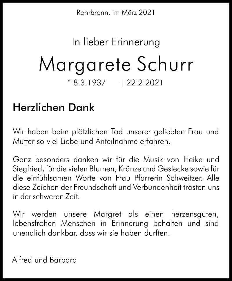 Hier finden Sie alle Traueranzeigen aus der Zeitung, die bisher für Margarete Schurr erschienen sind. Weitere Traueranzeigen, die in der Zeitung erscheinen, werden hier ebenfalls aufgelistet