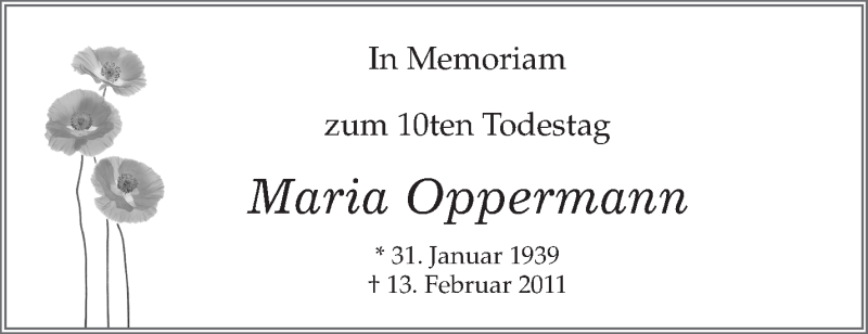 Hier finden Sie alle Traueranzeigen aus der Zeitung, die bisher für Maria Oppermann erschienen sind. Weitere Traueranzeigen, die in der Zeitung erscheinen, werden hier ebenfalls aufgelistet