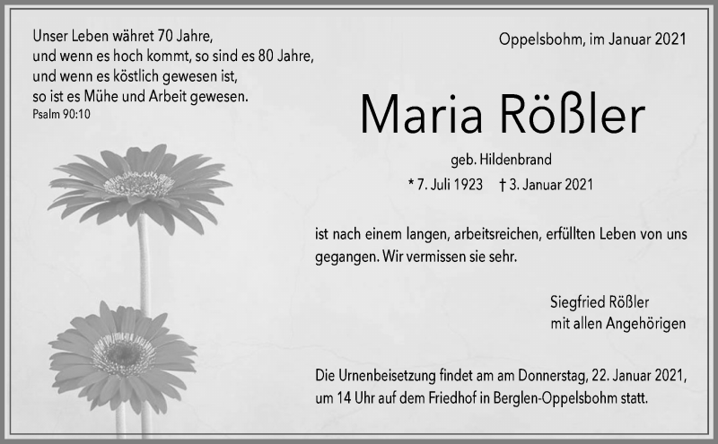 Hier finden Sie alle Traueranzeigen aus der Zeitung, die bisher für Maria Rößler erschienen sind. Weitere Traueranzeigen, die in der Zeitung erscheinen, werden hier ebenfalls aufgelistet