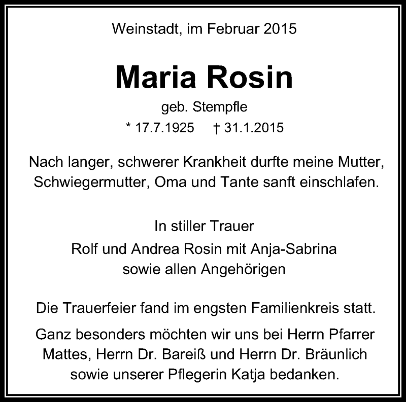 Hier finden Sie alle Traueranzeigen aus der Zeitung, die bisher für Maria Rosin erschienen sind. Weitere Traueranzeigen, die in der Zeitung erscheinen, werden hier ebenfalls aufgelistet