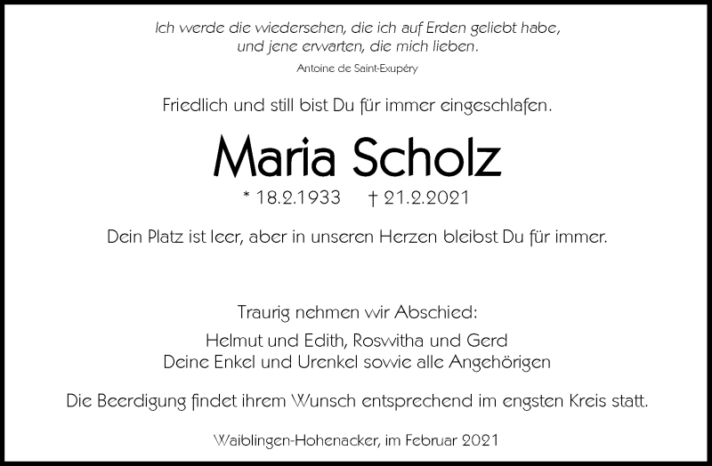 Hier finden Sie alle Traueranzeigen aus der Zeitung, die bisher für Maria Scholz erschienen sind. Weitere Traueranzeigen, die in der Zeitung erscheinen, werden hier ebenfalls aufgelistet