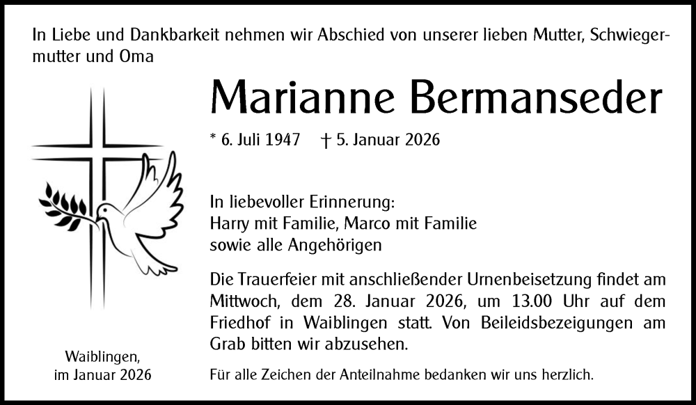 Hier finden Sie alle Traueranzeigen aus der Zeitung, die bisher für Marianne Bermanseder erschienen sind. Weitere Traueranzeigen, die in der Zeitung erscheinen, werden hier ebenfalls aufgelistet