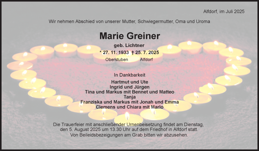 Hier finden Sie alle Traueranzeigen aus der Zeitung, die bisher für Marie Greiner erschienen sind. Weitere Traueranzeigen, die in der Zeitung erscheinen, werden hier ebenfalls aufgelistet