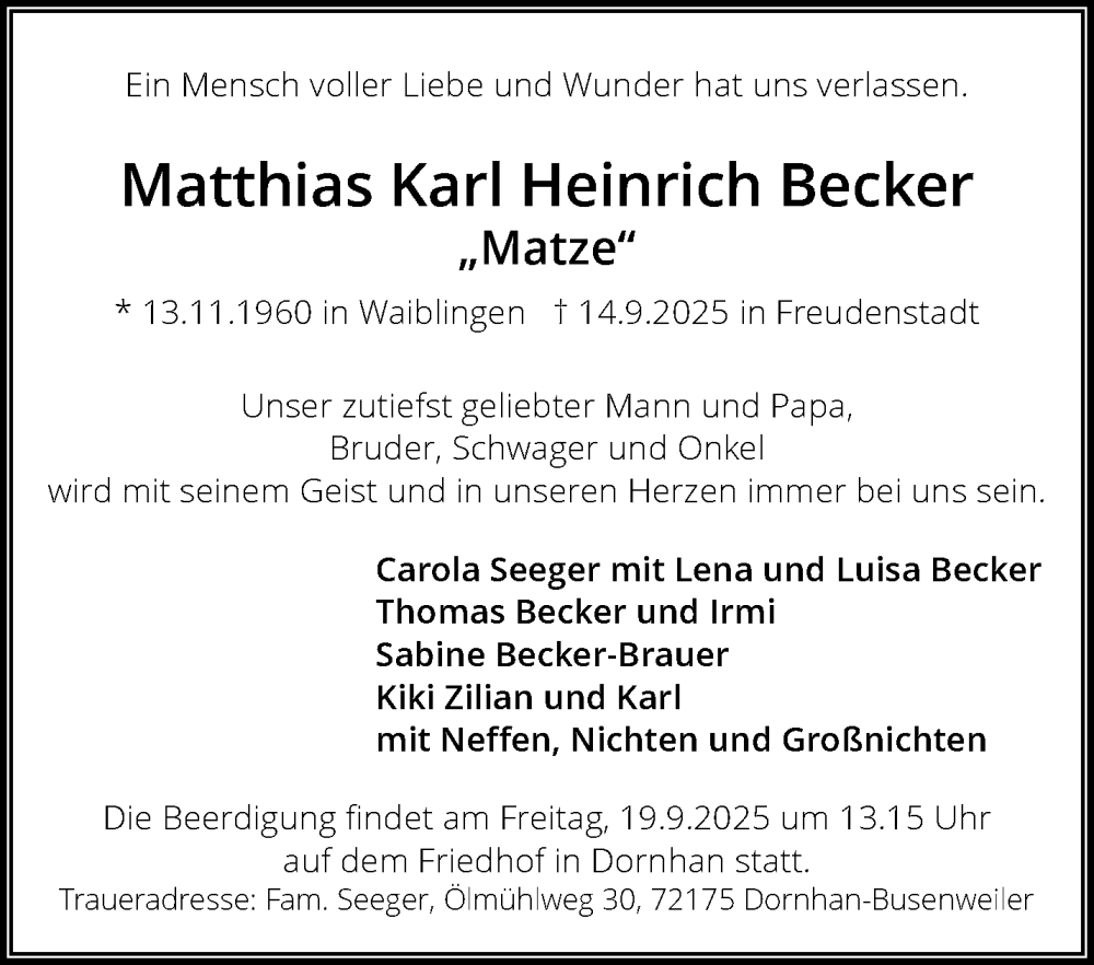 Hier finden Sie alle Traueranzeigen aus der Zeitung, die bisher für Matthias Karl Heinrich Becker erschienen sind. Weitere Traueranzeigen, die in der Zeitung erscheinen, werden hier ebenfalls aufgelistet