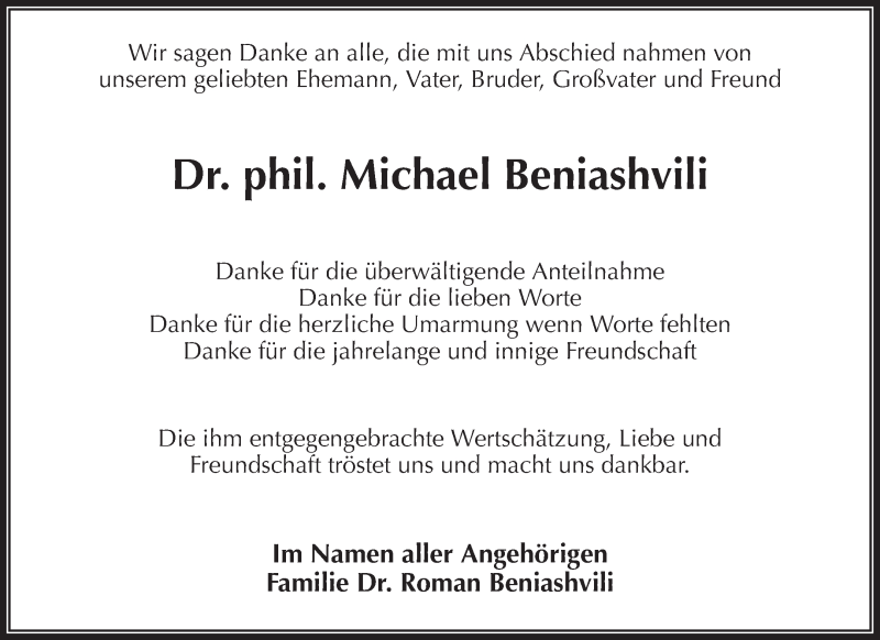 Hier finden Sie alle Traueranzeigen aus der Zeitung, die bisher für Michael Beniashvili erschienen sind. Weitere Traueranzeigen, die in der Zeitung erscheinen, werden hier ebenfalls aufgelistet