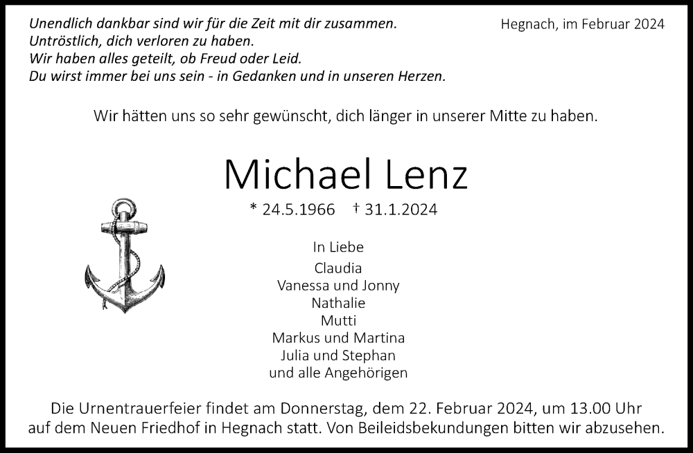 Hier finden Sie alle Traueranzeigen aus der Zeitung, die bisher für Michael Lenz erschienen sind. Weitere Traueranzeigen, die in der Zeitung erscheinen, werden hier ebenfalls aufgelistet
