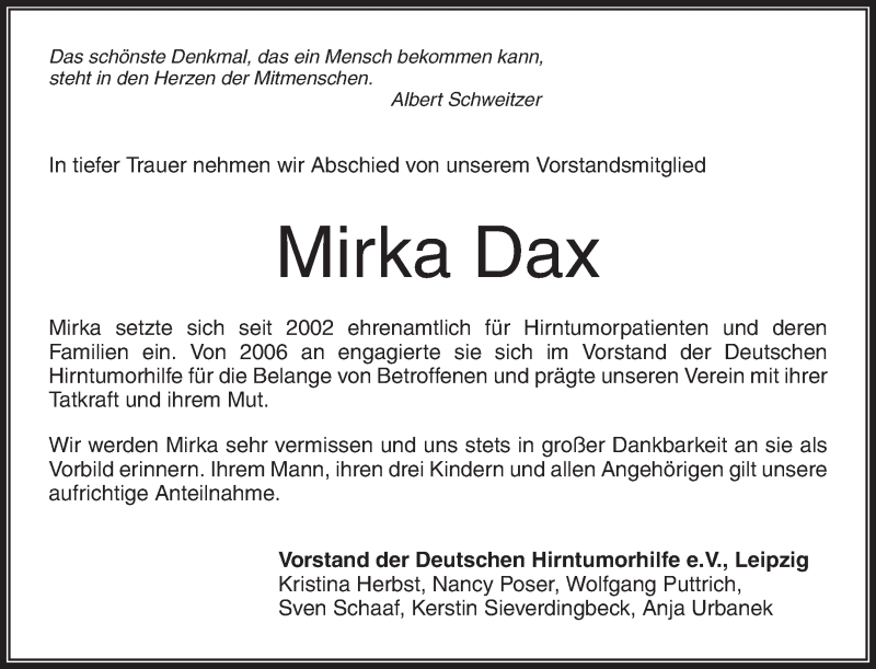 Hier finden Sie alle Traueranzeigen aus der Zeitung, die bisher für Mirka Dax erschienen sind. Weitere Traueranzeigen, die in der Zeitung erscheinen, werden hier ebenfalls aufgelistet