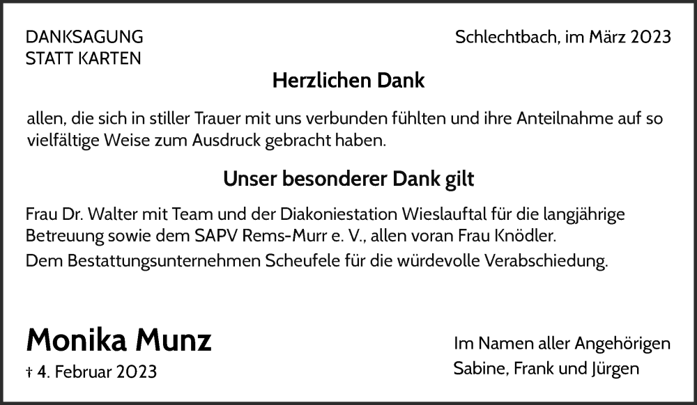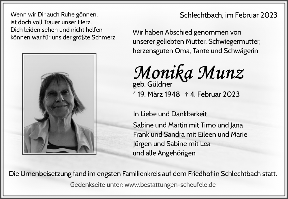 Hier finden Sie alle Traueranzeigen aus der Zeitung, die bisher für Monika Munz erschienen sind. Weitere Traueranzeigen, die in der Zeitung erscheinen, werden hier ebenfalls aufgelistet