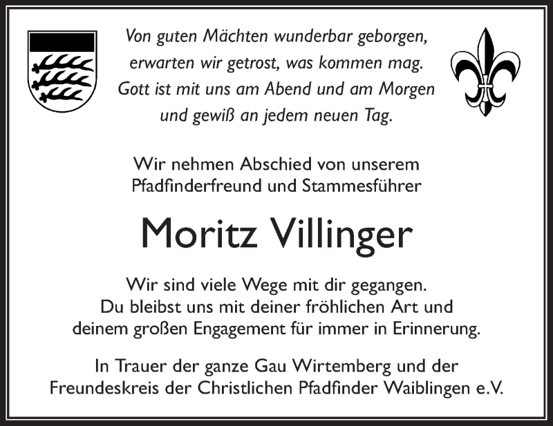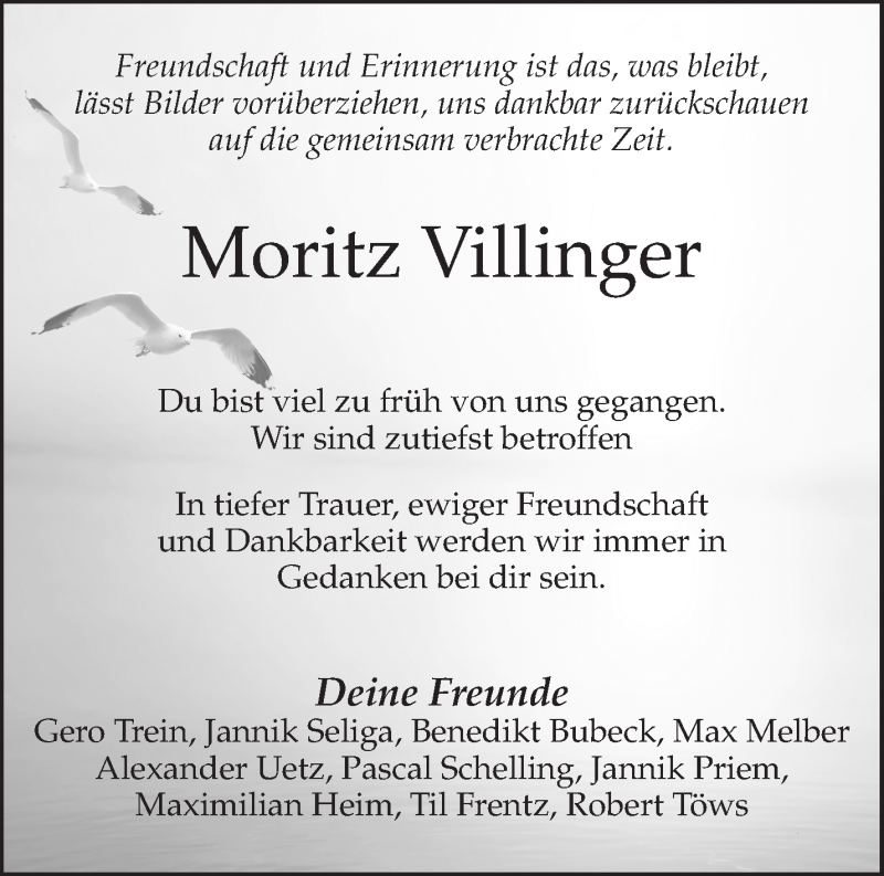Hier finden Sie alle Traueranzeigen aus der Zeitung, die bisher für Moritz Villinger erschienen sind. Weitere Traueranzeigen, die in der Zeitung erscheinen, werden hier ebenfalls aufgelistet