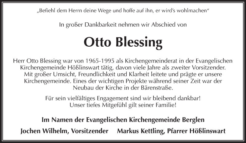 Hier finden Sie alle Traueranzeigen aus der Zeitung, die bisher für Otto Blessing erschienen sind. Weitere Traueranzeigen, die in der Zeitung erscheinen, werden hier ebenfalls aufgelistet