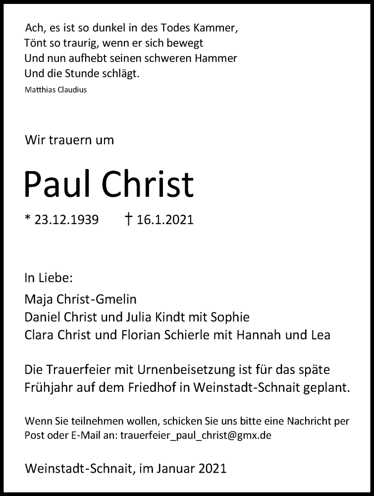 Hier finden Sie alle Traueranzeigen aus der Zeitung, die bisher für Paul Christ erschienen sind. Weitere Traueranzeigen, die in der Zeitung erscheinen, werden hier ebenfalls aufgelistet