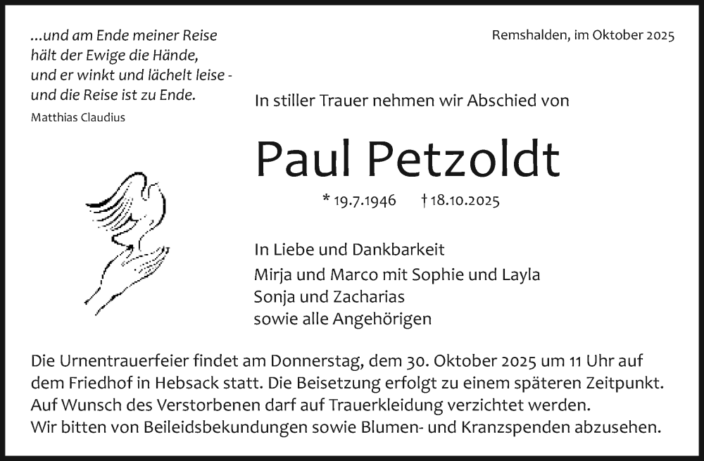 Hier finden Sie alle Traueranzeigen aus der Zeitung, die bisher für Paul Petzoldt erschienen sind. Weitere Traueranzeigen, die in der Zeitung erscheinen, werden hier ebenfalls aufgelistet