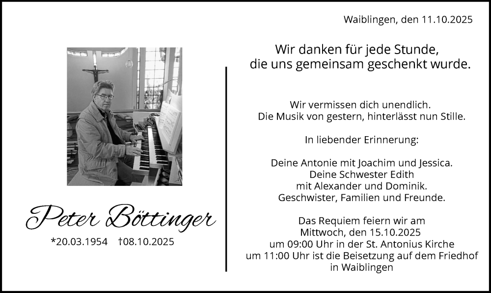 Hier finden Sie alle Traueranzeigen aus der Zeitung, die bisher für Peter Böttinger erschienen sind. Weitere Traueranzeigen, die in der Zeitung erscheinen, werden hier ebenfalls aufgelistet
