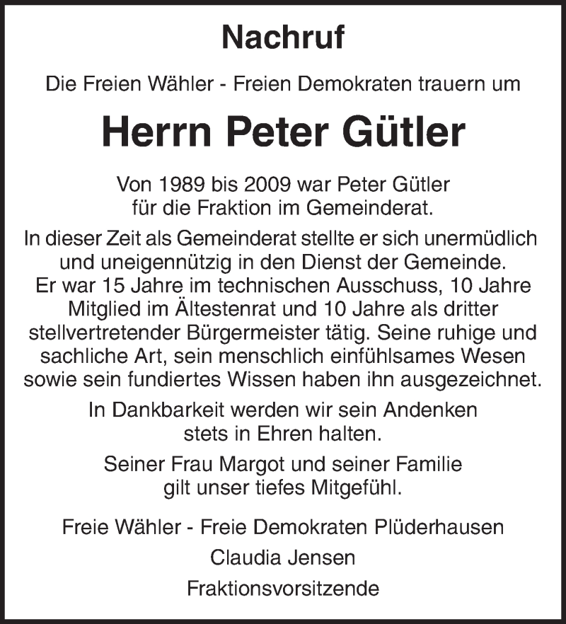 Hier finden Sie alle Traueranzeigen aus der Zeitung, die bisher für Peter Gütler erschienen sind. Weitere Traueranzeigen, die in der Zeitung erscheinen, werden hier ebenfalls aufgelistet